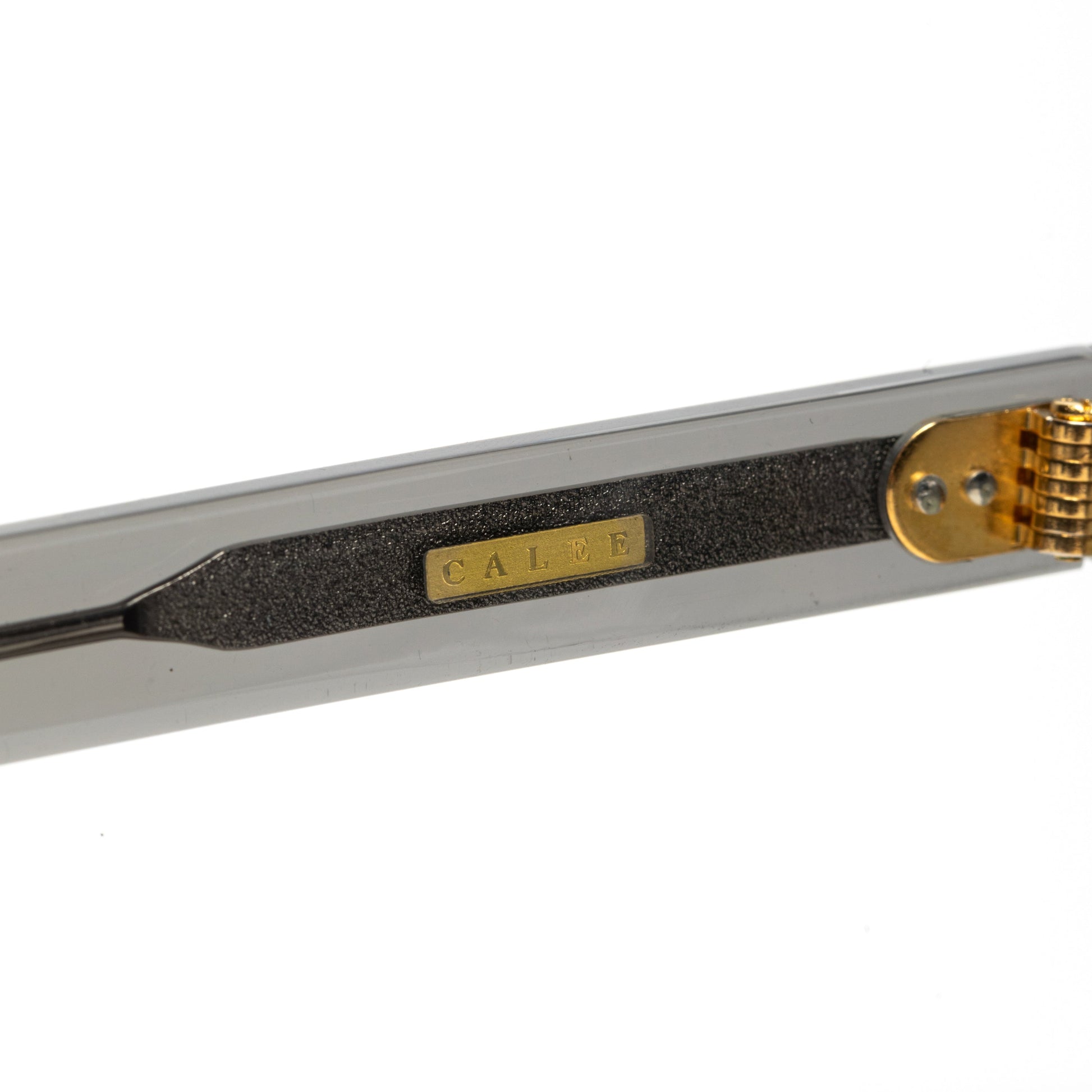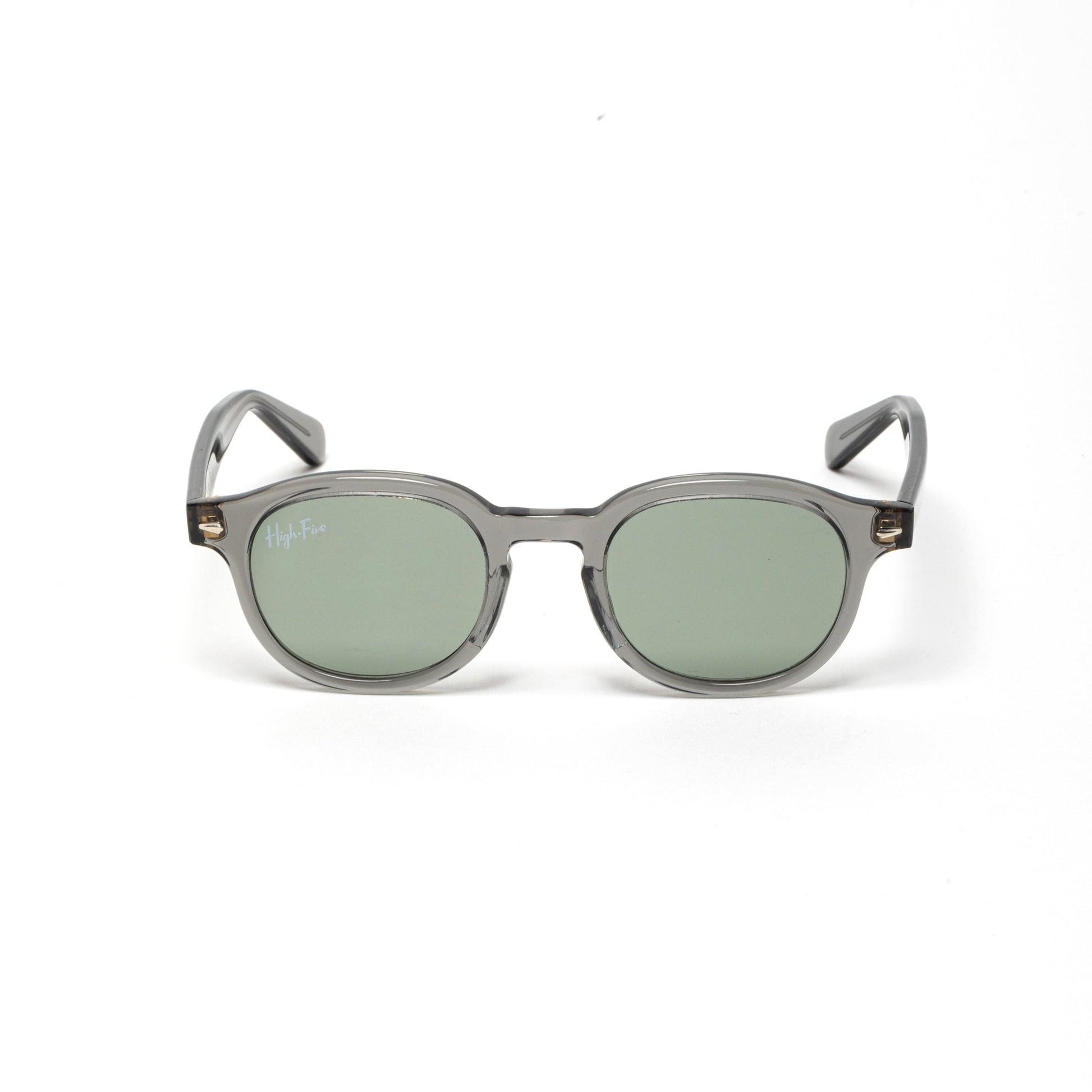 眼鏡の聖地、福井県鯖江市で製作したボストン×ウェリントタイプのグラシーズ。レンズは偏光レンズを使用。レンズにHIGH FIVEのブランドロゴ、テンプルにCALEEと鯖江製のロゴを落としたデザイン。